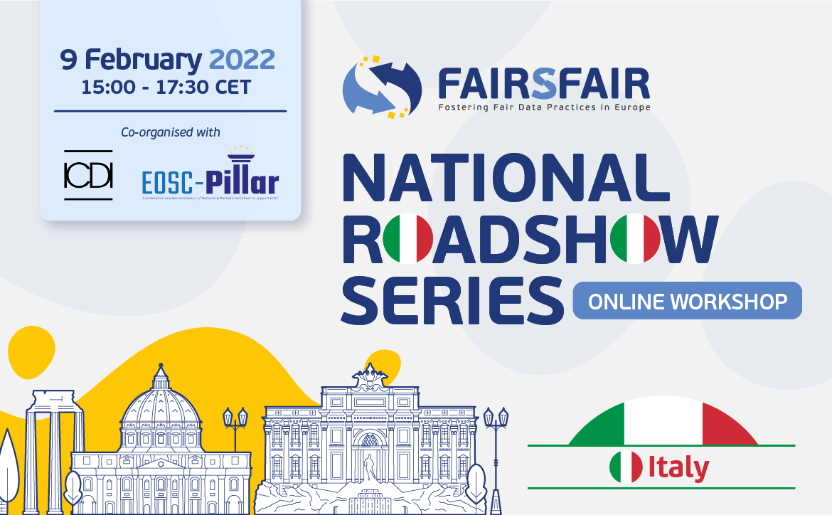 FAIRsFAIR is glad to come and visit Italy with the last event of its National Roadshow series, organised in collaboration with ICDI, the Italian Computing and Data Infrastructure, and the EOSC Pillar project. Experts from the Italian education and research panorama will debate about how to support higher education institutions with practical implementation of the FAIR principles. Good practices and stories of successful integration of Research Data Management (RDM) and FAIR data-related skills in Italian university curricula and training will also be presented.
