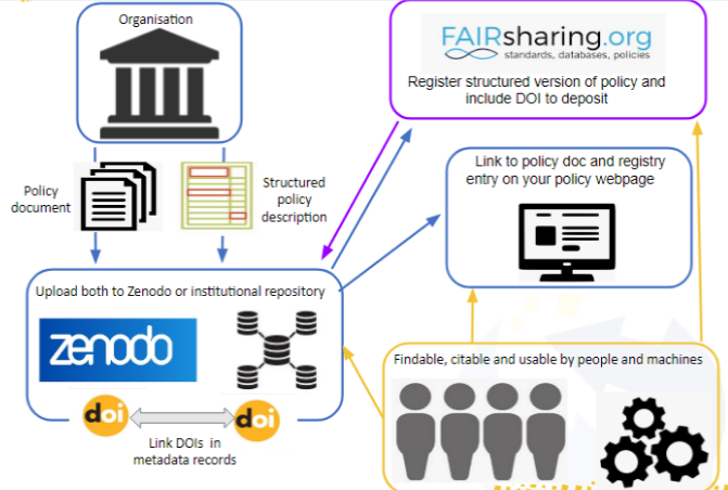 - Policies themselves should be FAIR. PIDs should be assigned to clearly versioned policies. These PIDs should be included in the metadata records in registries such as FAIRsharing.org or other policy registry services.